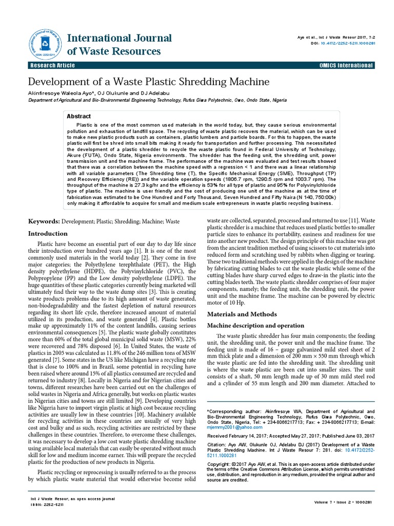 This paper discusses the design of a 5HP Portable plastic shredder which will be useful for Waste management in Industrial as well as localities to dispose of thermoplastics by converting them into flakes which can be further reused for variety of applications. In Design and development of mini plastic shredder by Sudhakara Reddy 3 they have come up with a basic design for plastic shredder machine which could be of. Waste shredder machine research paper.